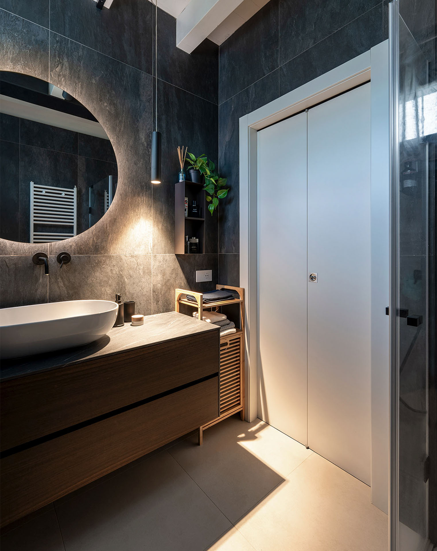 Il pavimento traslucido color sabbia effetto resina esalta la resa dura e materica del rivestimento a grandi lastre in ardesia nera. La rubinetteria e i profili della doccia neri opachi accentuano il mood deciso di questo ambiente. L’illuminazione direzionata generata dal pendente e dai proiettori orientabili mettono in risalto la resa materica del rivestimento scuro. Il risultato è un bagno di grande impatto visivo e dalla forte personalità.