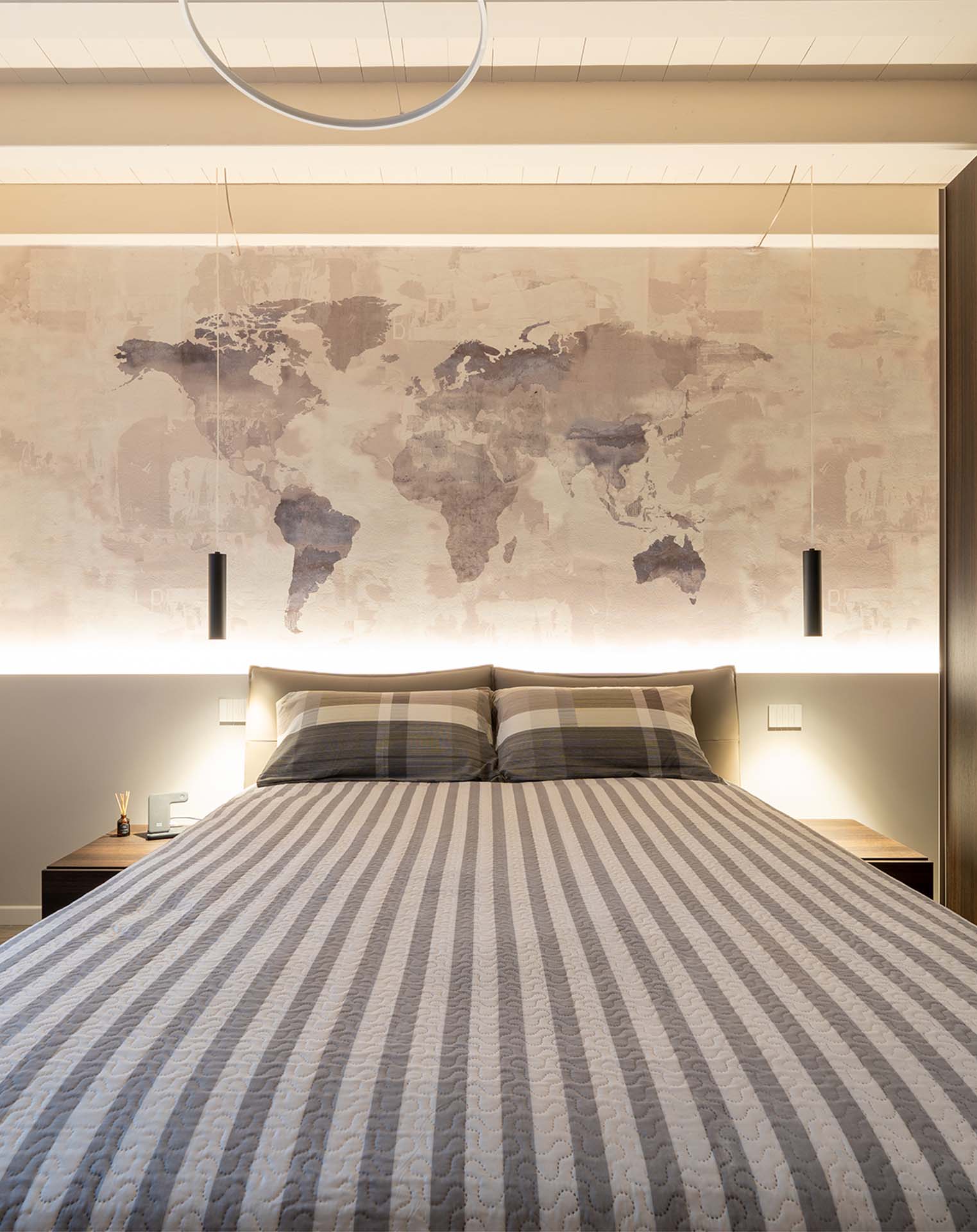La carta da parati Hotspot della Glamora caratterizza la testata superiore del letto, richiamando il tema del viaggio. La tonalità grigia contestualizza perfettamente questo elemento all’interno di questa camera matrimoniale. La testata del letto inferiore invece è stata arricchita dalla presenza di una controparete bassa con strip-led integrata su cui viene posata una mensola in legno laccata bianca, dove possono essere posizionati complementi di arredo, oggetti personali, libri. Nonostante la presenza delle travi in legno, due pendenti cilindrici neri si calano dall’alto e illuminano i comodini.