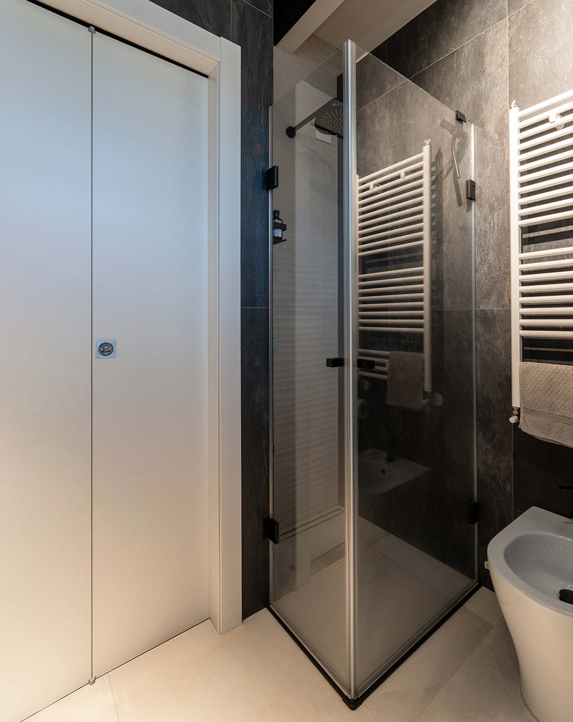 Dal punto di vista distributivo, viste le dimensioni ridotte, la disposizione è stata completamente revisionata e ottimizzata al fine di sfruttare ogni centimetro disponibile. Una porta con apertura a battente spingere interno è stata sostituita con una porta con apertura a libro tirare esterno per garantire quanto più spazio disponibile all’interno del bagno. Per conferire un maggiore senso di continuità visiva e per ridurre la percezione di un ambiente ristretto, il piatto doccia è stato realizzato uniforme alla pavimentazione.