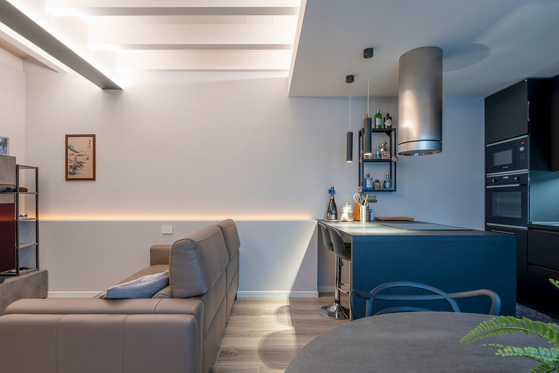 Un living dalla molteplici atmosfere. Grazie ad uno studio accurato dell’illuminazione, è stato possibile generare uno spazio ricercato e mutevole in base alle esigenze e al mood delle persone che lo vivono: da un ambiente rilassante ad uno più stimolante.